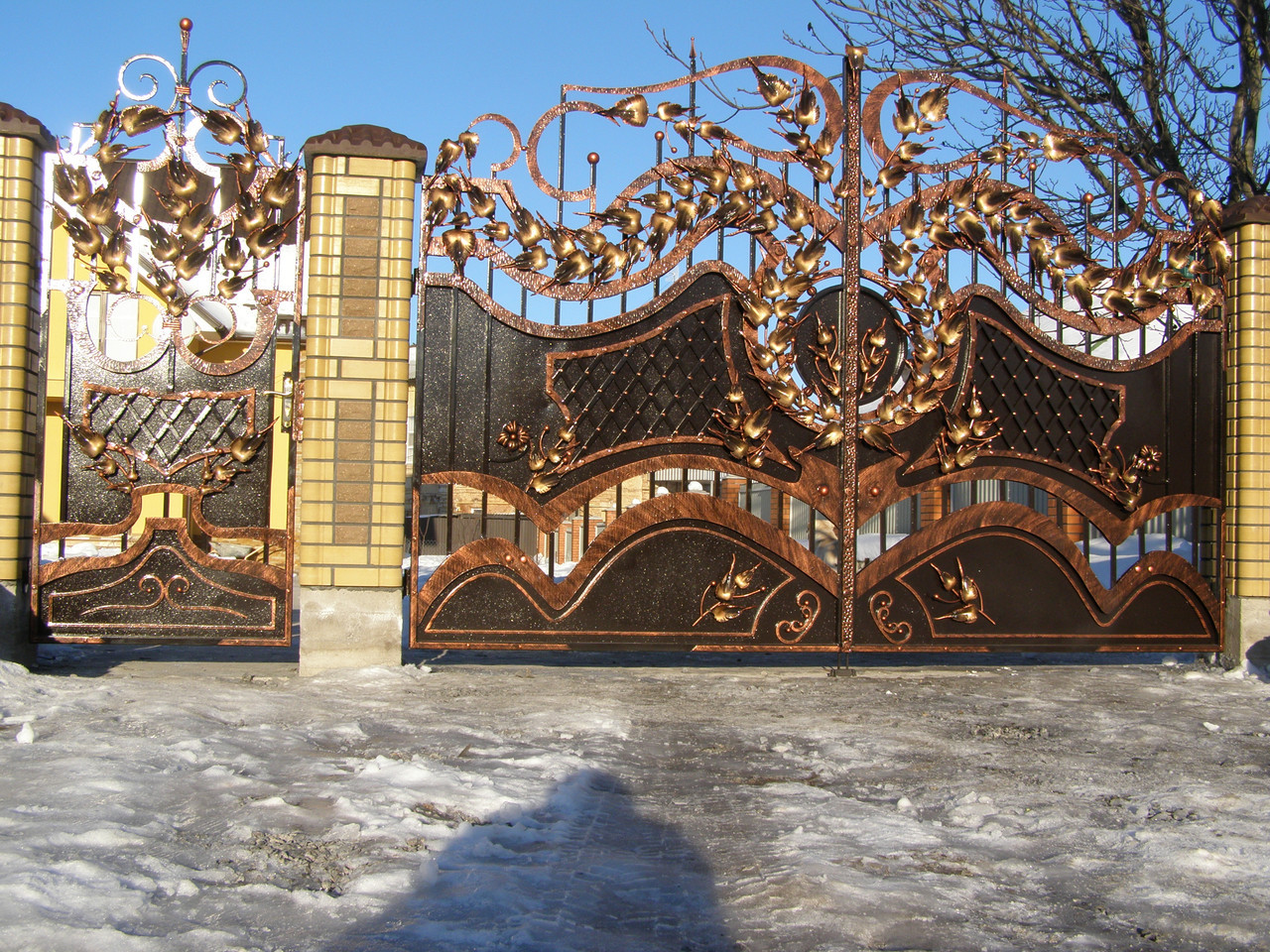 Чудові ковані ворота «Астра» виготовляються за індивідуальним замовленням і стануть яскравим показником вашого стилю і відмінного смаку. Вони зроблені в чорному кольорі з золотими вставками і точно привернуть увагу не тільки ваших сусідів, а й гостей. Брама покрита порошком з алюмоцинком, який захищає її від корозії і механічних пошкоджень, а також лаком. Вона може бути відкатною або розпашною – все залежить від ваших уподобань. Ось стандартні розміри воріт: каркас 40/25, карбування 1,5 мм, коло 12 і 14, ширина воріт 3,8 м, плече по краю 1,7 м, хвіртка 1 м. Ми також безкоштовно виїжджаємо на заміри в разі потреби. Монтаж входить у вартість.